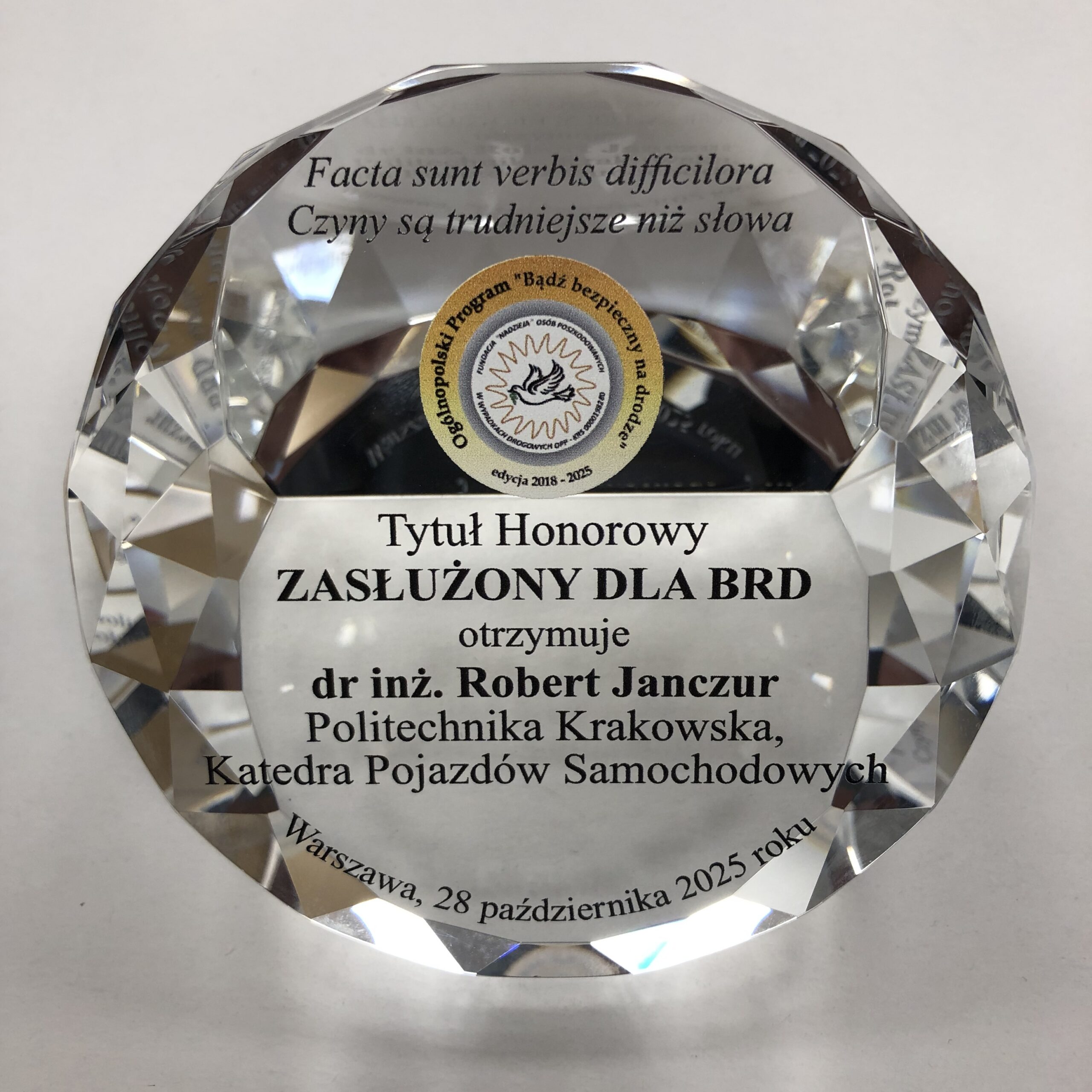 Dr inż. Robert Janczur, prof. PK uhonorowany tytułem „Zasłużony dla Bezpieczeństwa Ruchu Drogowego”