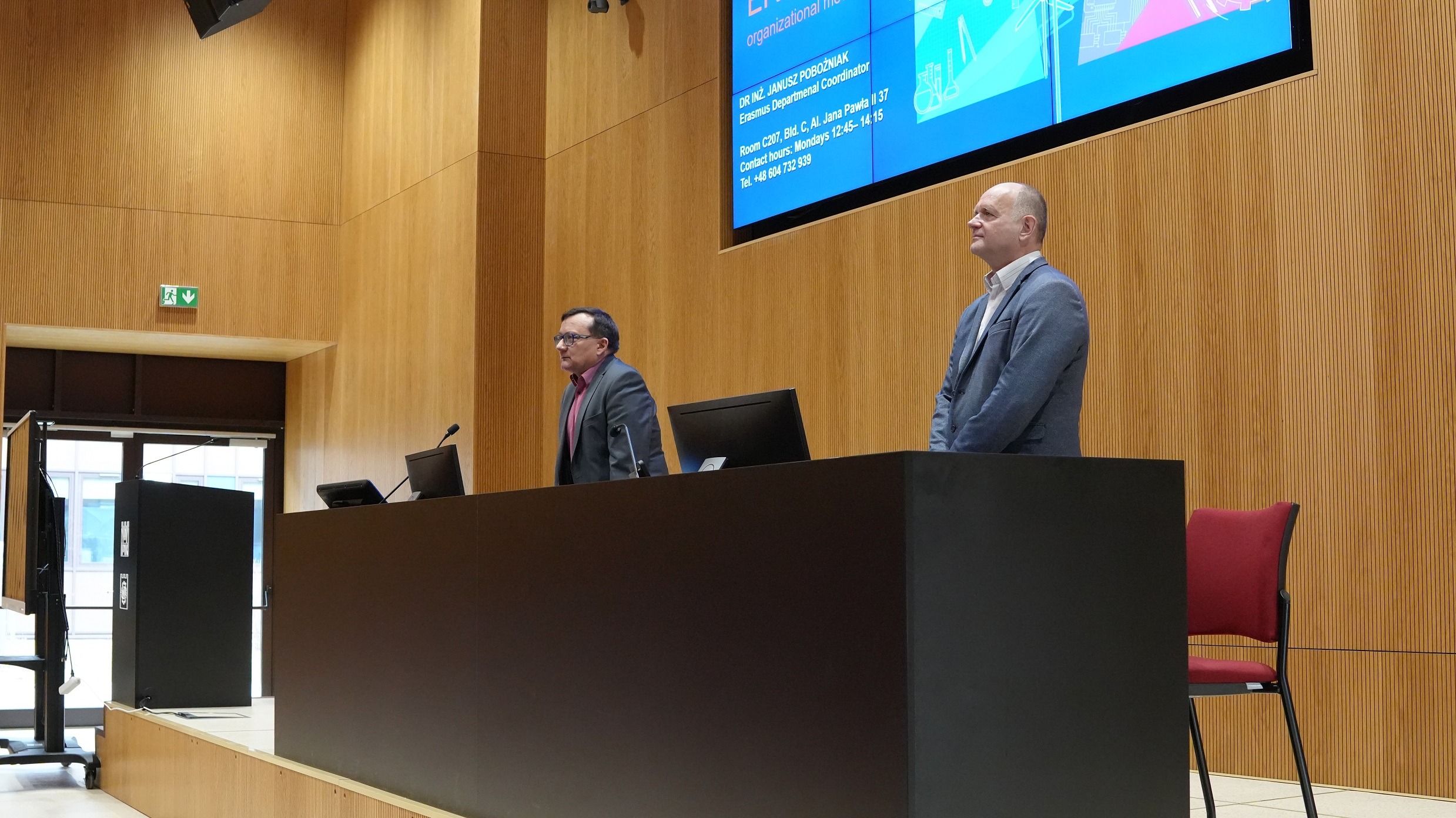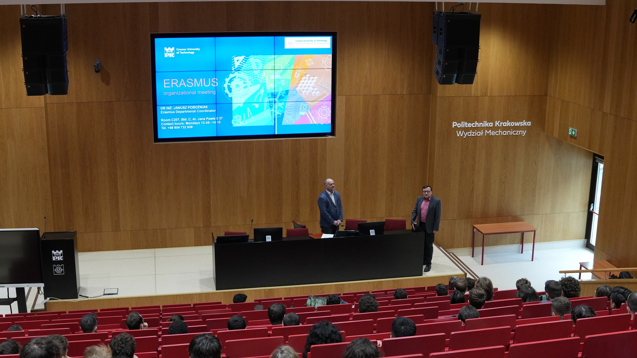 Gości powitał Prodziekan Wydziału Mechanicznego prof. Bogdan Szybiński, podkreślając międzynarodowy charakter wydziału oraz znaczenie współpracy akademickiej w ramach programu Erasmus+. Spotkanie poprowadził Koordynator Wydziałowy programu Erasmus ds. Studentów Przyjeżdżających dr inż. Janusz Pobożniak. Spotkanie miało na celu przygotowanie studentów do rozpoczęcia nauki oraz omówienie najważniejszych kwestii organizacyjnych. Uczestnicy uzyskali informacje dotyczące m.in. planu zajęć, legitymacji studenckich, zakładania kont na platformie MS Teams oraz aktywacji uczelnianych kont pocztowych w domenie Politechniki Krakowskiej.