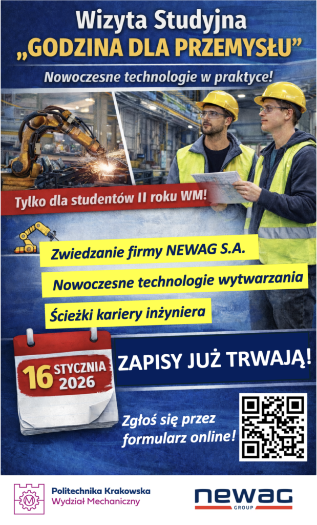 Zapraszamy Was do udziału w wyjazdowej wizycie studyjnej w ramach „Godziny dla przemysłu: Inżynieria w praktyce”, która odbędzie się 16 stycznia 2026 r. w firmie NEWAG S.A. w Nowym Sączu.