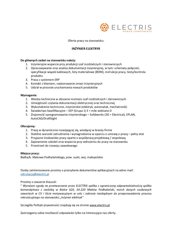 Strona główna / Aktualności / Oferta pracy Electris