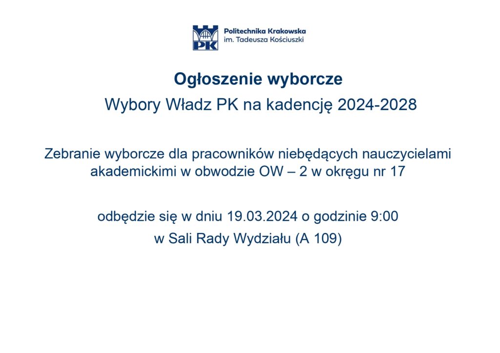 w związku z rozpoczęciem procedur związanych z wyborami Władz Politechniki Krakowskiej na kadencję 2024-2028, uprzejmie informujemy, że spotkanie wyborcze dla Pracowników niebędących nauczycielami akademickimi odbędzie się: