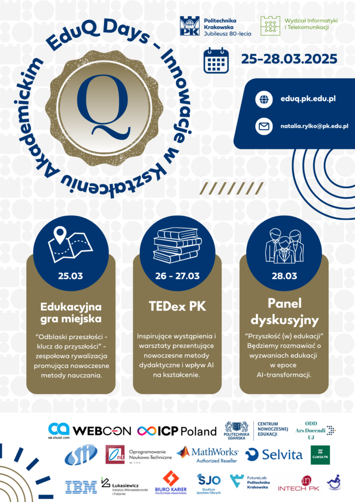 EduQ Days to wyjątkowe wydarzenie poświęcone nowoczesnym metodom kształcenia akademickiego, które odbędzie się w dniach 25-28 marca 2025 r. na Politechnice Krakowskiej. Celem inicjatywy jest wymiana doświadczeń, wdrażanie innowacyjnych rozwiązań dydaktycznych oraz budowanie współpracy pomiędzy kadrą akademicką, studentami i przedstawicielami sektora edukacyjnego oraz biznesowego.