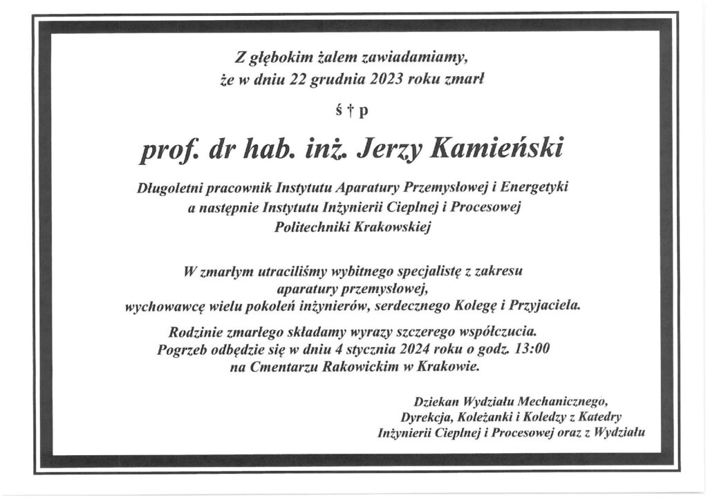 Zmarł prof. Jerzy Kamieński Z głębokim żalem informujemy, że zmarł prof. dr hab. inż. Jerzy Kamieński długoletni pracownik Instytutu Aparatury Przemysłowej i Energetyki, a następnie Instytutu Inżynierii Cieplnej i Procesowej Wydziału Mechanicznego Politechniki Krakowskiej.