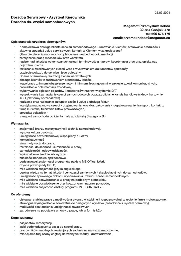 Strona główna / Ogłoszenia / Oferta pracy od firmy MEGAMOT