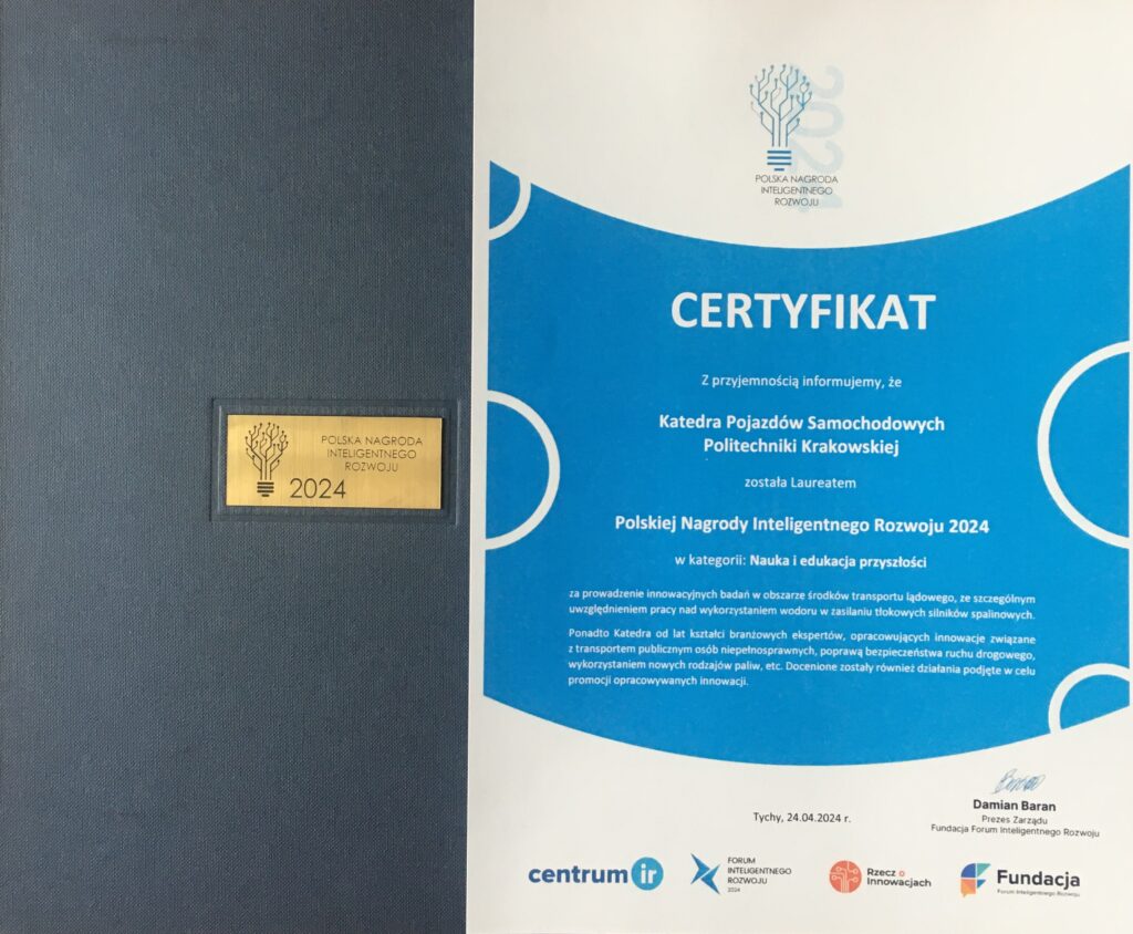 Zwieńczeniem Forum Inteligentnego Rozwoju była gala, podczas której wręczone zostały statuetki i certyfikaty Polskiej Nagrody Inteligentnego Rozwoju, dedykowanej osobom i organizacjom prowadzącym innowacyjną działalność, zarówno w sferze technologii jak i społecznej oraz dążącym do przełożenia swojej pracy na konkretne efekty dla praktyki gospodarczej i społeczeństwa. Wyjątkowa i prestiżowa w środowisku biznesowym i naukowym nagroda jest wyrazem szacunku dla pomysłu, a także planu na przyszłość realizowanego projektu i podejścia do jego promocji. W kategorii „Nauka i edukacja przyszłości” Polską Nagrodą Inteligentnego Rozwoju 2024 uhonorowana została Katedra Pojazdów Samochodowych Wydziału Mechanicznego Politechniki Krakowskiej. Jak napisano w uzasadnieniu, nagroda dla KPS została przyznana za prowadzenie innowacyjnych badań w obszarze środków transportu lądowego, ze szczególnym uwzględnieniem pracy nad wykorzystaniem wodoru w zasilaniu tłokowych silników spalinowych. Podkreślono też zaangażowanie Katedry Pojazdów Samochodowych PK w proces kształcenia branżowych ekspertów, opracowujących innowacyjne rozwiązania związane m.in. z transportem publicznym osób z niepełnosprawnościami, poprawą bezpieczeństwa ruchu drogowego, wykorzystaniem nowych rodzajów paliw itp. Nagrodę i certyfikat dla Katedry odebrali prof. dr hab. inż. Marek Brzeżański i dr inż. Michał Mareczek.