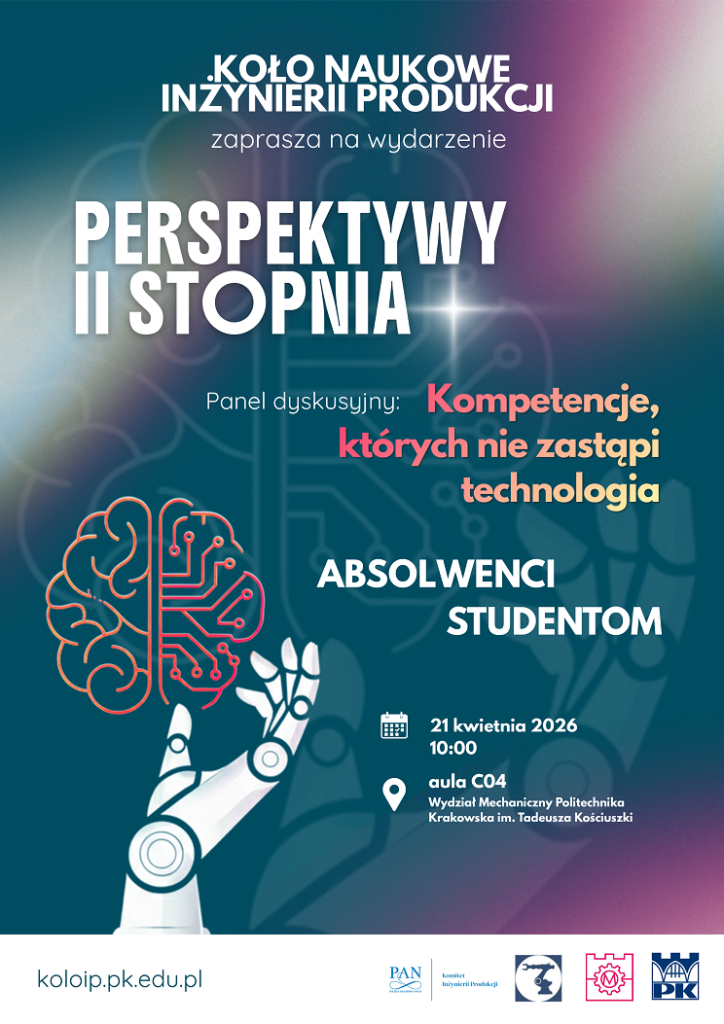 Koło Naukowe Inżynierii Produkcji działające na Wydziale Mechanicznym zaprasza studentów na wydarzenie „Perspektywy II stopnia”, które pomoże spojrzeć szerzej na możliwości dalszego rozwoju po studiach inżynierskich.