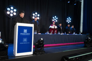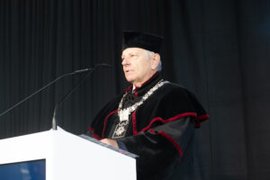 Kolejnym punktem programu był wykład inauguracyjny byłego dziekana Wydziału i zwycięzcy konkursu na najlepszego wykładowcę z 2022 roku – prof. Leszka Wojnara pt. „Techniki Prezentacji ” .