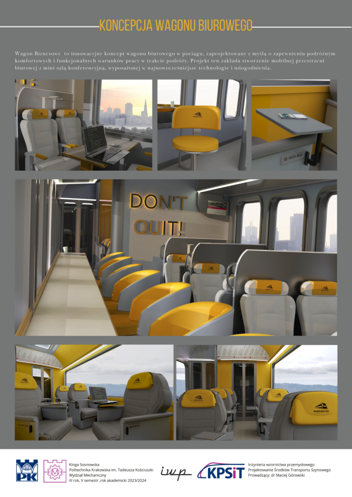 Wagon biznesowy to propozycja innowacyjnego wagonu biurowego z komfortową i funkcjonalną przestrzenią do pracy. Projekt Kingi Sosnowskiej, studentki III roku inżynierii wzornictwa przemysłowego, zakłada stworzenie w pociągu mobilnej przestrzeni biurowej z mini salą konferencyjną, wyposażoną w najnowocześniejsze technologie i udogodnienia.