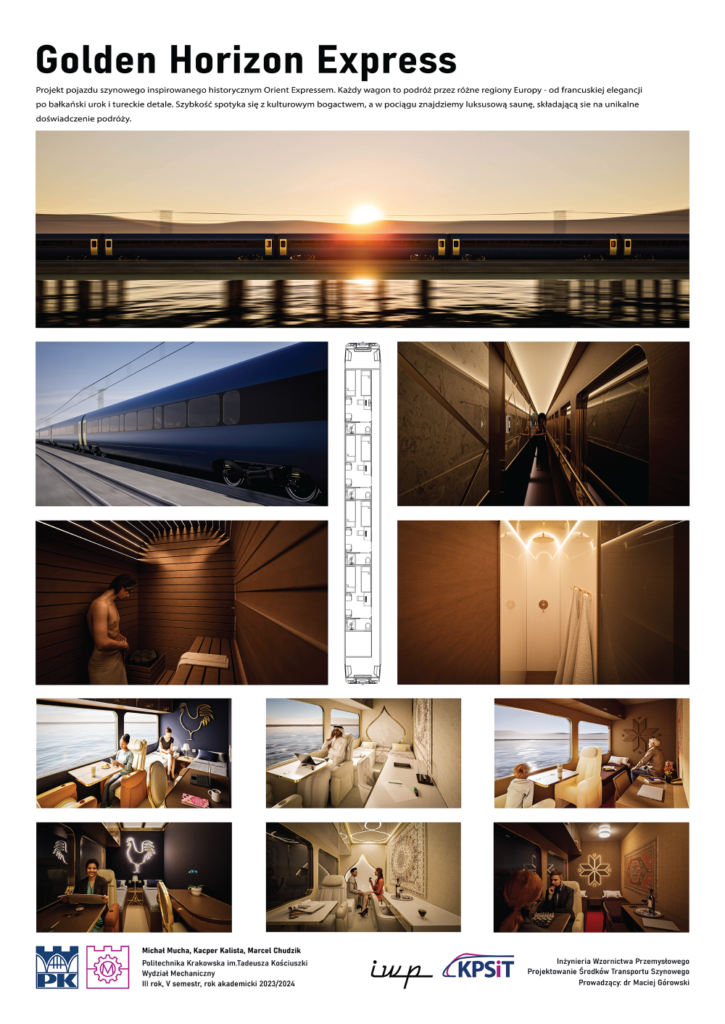 Wśród ciekawych projektów studentów są też bardziej futurystyczne koncepcje pojazdów przyszłości. Fani Orient Expressu Michał Mucha, Kacper Kalista i Marcel Chudzik zaprojektowali „Golden Horizon Express”, w którym każdy wagon to podróż przez różne regiony Europy – od francuskiej elegancji, przez bałkański urok i tureckie detale. – Szybkość spotyka się tu z kulturowym bogactwem – reklamują swój pomysł młodzi projektanci.
