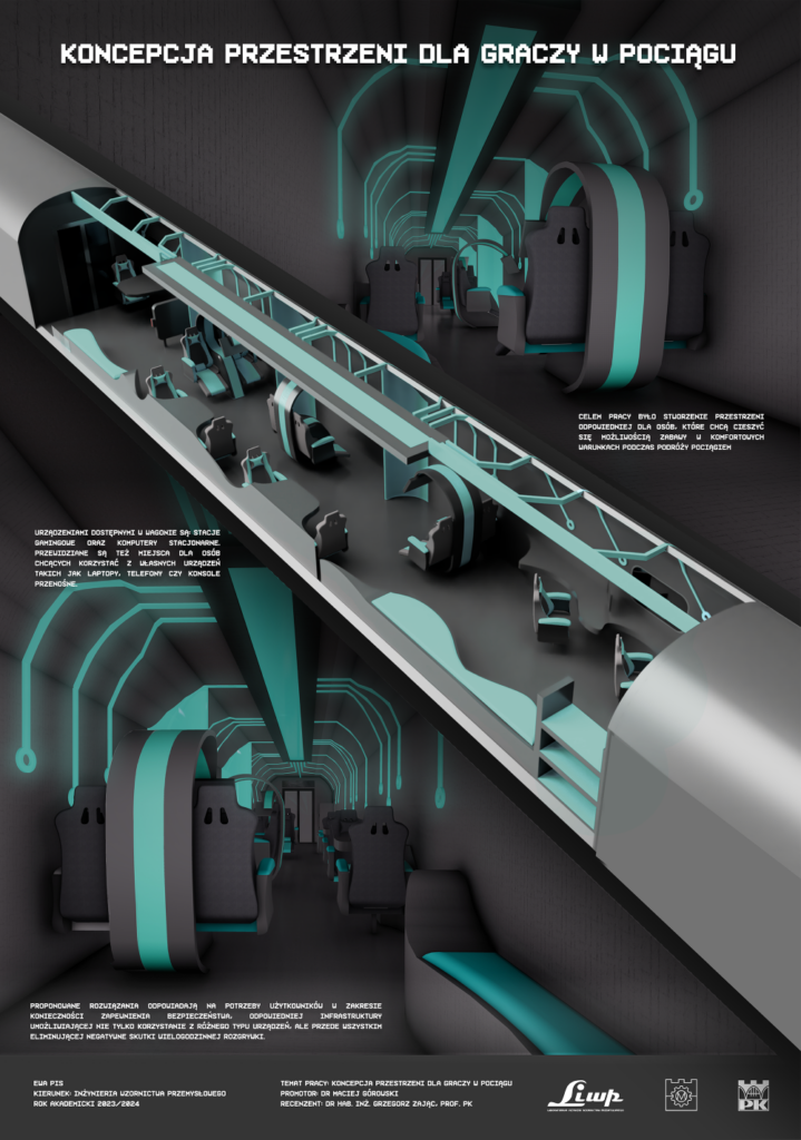 Jest też studencki pomysł dla tych, którzy kilka godzin w pociągu chcieliby spędzić po prostu relaksując się grą w gry komputerowe. W wagonie dla graczy, zaprojektowanym przez Ewę Pis w ramach pracy inżynierskiej, są stacje gamingowe i komputery stacjonarne, są też stanowiska dla osób z własnymi urządzeniami – laptopami czy konsolami. – Proponowane rozwiązania odpowiadają na potrzeby użytkowników w zakresie zapewnienia im bezpieczeństwa, odpowiedniej infrastruktury do gry, jednocześnie eliminującej negatywne skutki wielogodzinnej rozgrywki – opisuje swój projekt autorka.
