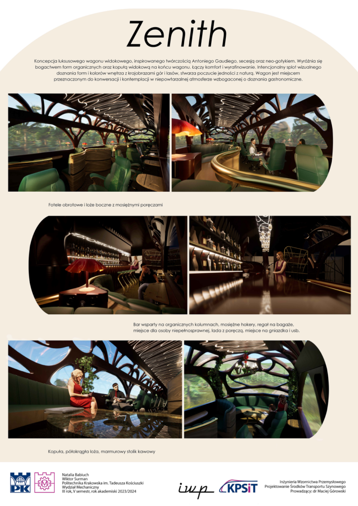 Na spełnienie marzeń bardzo wymagających klientów kolei postawili też Natalia Babiuch i Wiktor Surman. Ich luksusowy wagon widokowy „Zenith” łączy komfort i wyrafinowanie, a jest inspirowany twórczością Antoniego Gaudiego, secesją i neogotykiem. – Wagon przeznaczony do kontemplacji i konwersacji wyróżnia się bogactwem form organicznych i kopułą widokową na końcu wagonu. Intencjonalny splot wizualnego doznania form i kolorów wnętrza z krajobrazami gór i lasów, stwarza poczucie jedności z naturą – przedstawiają swój projekt studenci III roku Politechniki Krakowskiej.