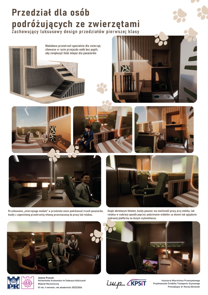 Jest też pomysł studentki III roku Joanny Proszek – dedykowany właścicielom psa czy kota, którzy marzą o komfortowej i bezstresowej podróży wspólnie ze swoim pupilem. Modułowa przestrzeń przedziału dla osób podróżujących ze zwierzętami mogłaby być swobodnie poddawana aranżacjom, by optymalnie zarządzać liczbą miejsc dla pasażerów.