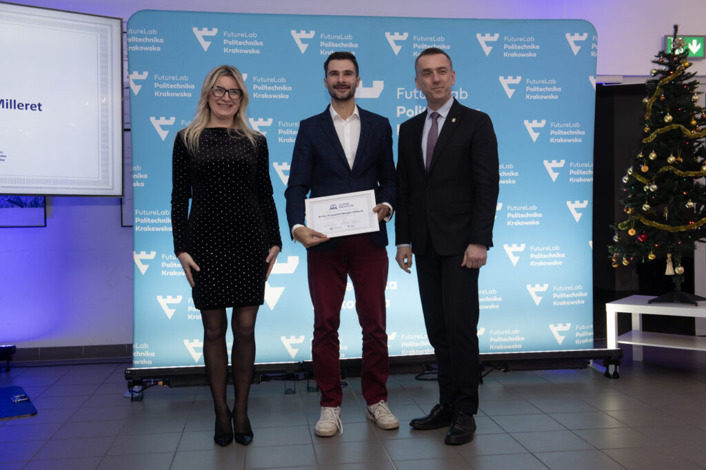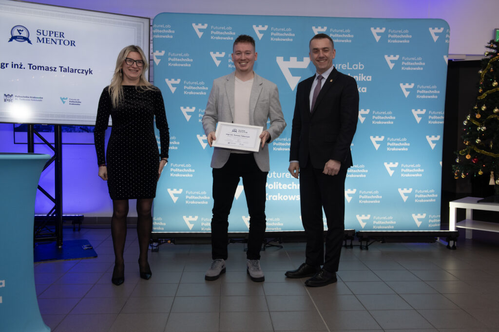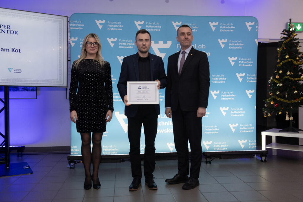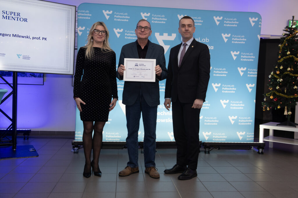 9 grudnia br., podczas przedświątecznego spotkania zorganizowanego przez FutureLab PK, po raz drugi w historii Politechniki Krakowskiej wręczone zostały nagrody SUPER MENTOR. Uhonorowano nimi osoby należące do społeczności akademickiej, które w sposób wyjątkowy i wykraczający poza standardowe obowiązki, wykonują swoją pracę mentorską ze studentami grup projektowych FutureLab. Nagrody wręczył rektor PK prof. dr hab. inż. Andrzej Szarata wraz z dyrektor FL Moniką Firlej.