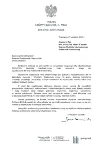 W imieniu Rektora Politechniki Krakowskiej głos zabrała prof. Magdalena Niemczewska–Wójcik, która przywitała studentów w murach uczelni, zachęcając ich do aktywności, odkrywania pasji i korzystania z bogatych tradycji PK: