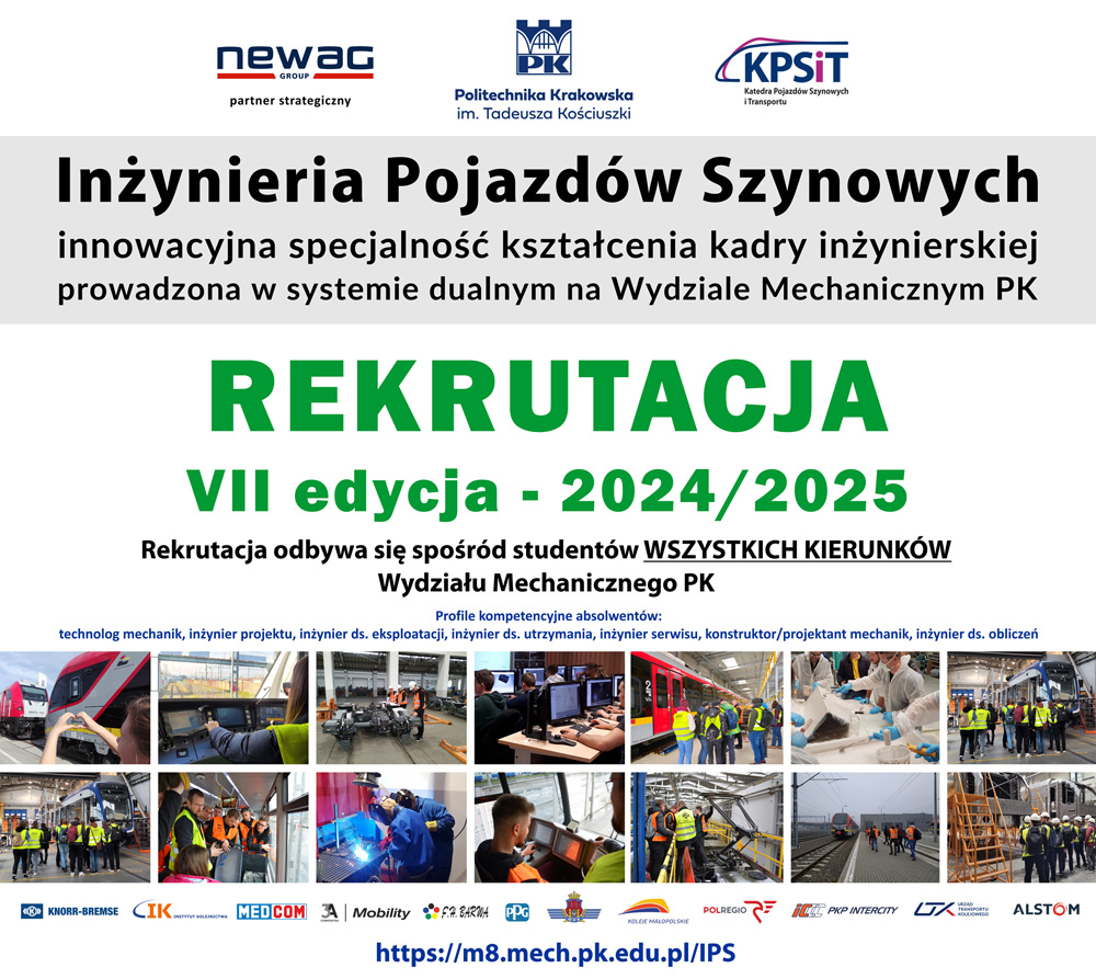 Katedra Pojazdów Szynowych i Transportu zaprasza studentów WSZYSTKICH kierunków na Wydziale Mechanicznym do udziału w rekrutacji na specjalność „Inżynieria Pojazdów Szynowych”.