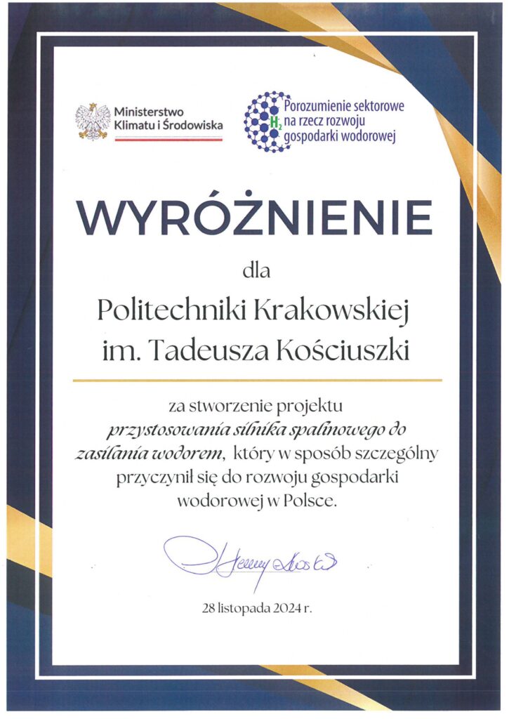Podczas V Konferencji Stron Porozumienia Sektorowego na rzecz rozwoju gospodarki wodorowej w Polsce Ministerstwo Klimatu i Środowiska wręczyło wyróżnienia za rozwój poszczególnych segmentów gospodarki wodorowej. Politechnika Krakowska jako jedyna Uczelnia otrzymała wyróżnienie za projekt przystosowania silnika spalinowego do zasilania wodorem. Autorami innowacyjnego rozwiązania są naukowcy z Katedry Pojazdów Samochodowych Wydziału Mechanicznego Politechniki pod kierunkiem prof. Marka Brzeżańskiego.