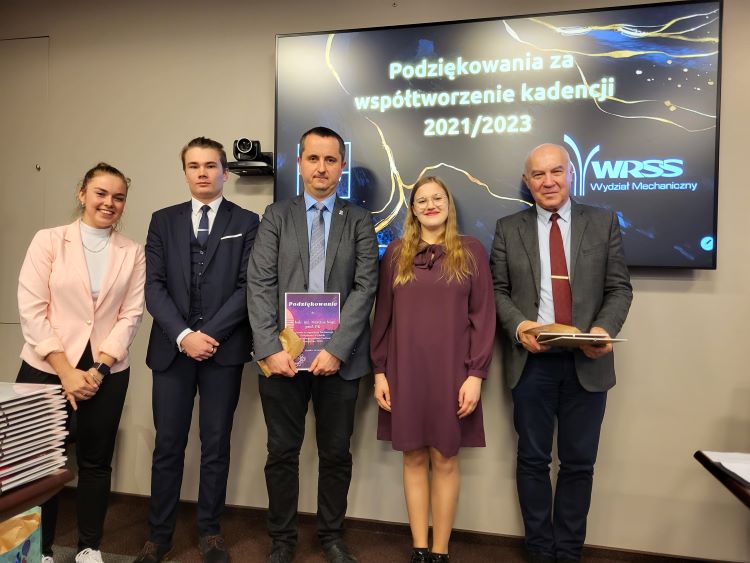 Studencka rada w składzie: Wioleta Łoś (przewodnicząca), Hubert Kołaczkowski (wiceprzewodniczący) oraz Julia Tkacz, Mateusz Borowski, Dawid Droździel, Dominik Czupidło, Ernest Lelek, Karolina Majcher, Krzysztof Borowczyk, Marlena Makuch, Wiktoria Pater, Łukasz Budziński, Łukasz Droździk podczas odbywającego się 15 listopada 41 posiedzenia Kolegium Wydziału Mechanicznego PK podsumowała współpracę z Władzami Wydziału.
