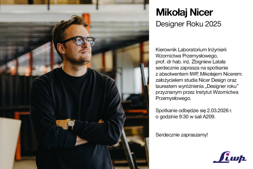 Kierownik Laboratorium Inżynierii Wzornictwa Przemysłowego, prof. dr hab. inż. Zbigniew Latała zaprasza na spotkanie w formule otwartej z Mikołajem Nicerem, absolwentem kierunku Inżynieria Wzornictwa Przemysłowego, designerem wyróżnionym tytułem „Designer Roku 2025”. Podczas spotkania Mikołaj Nicer opowie o swojej twórczości i działalności studia, a także odpowie na pytania zgromadzonych gości.